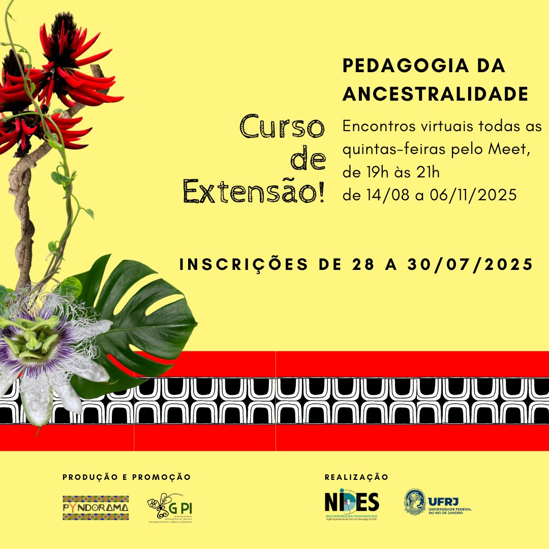 Este curso é voltado ao debate sobre as cosmopercepções de povos originários da África e das Américas, bem como as formas e estratégias próprias dessas comunidades para transmitir legados e memórias. É um espaço de incentivo e promoção da consciência sobre processos de racialização, construção de corpo, identidade e pertencimento. O curso é virtual e terá 13 semanas de duração, completando 96 horas. Os encontros on-line ocorrerão às quintas-feiras, de 19h00 às 21h00, de 14/08 a 06/11 de 2025.